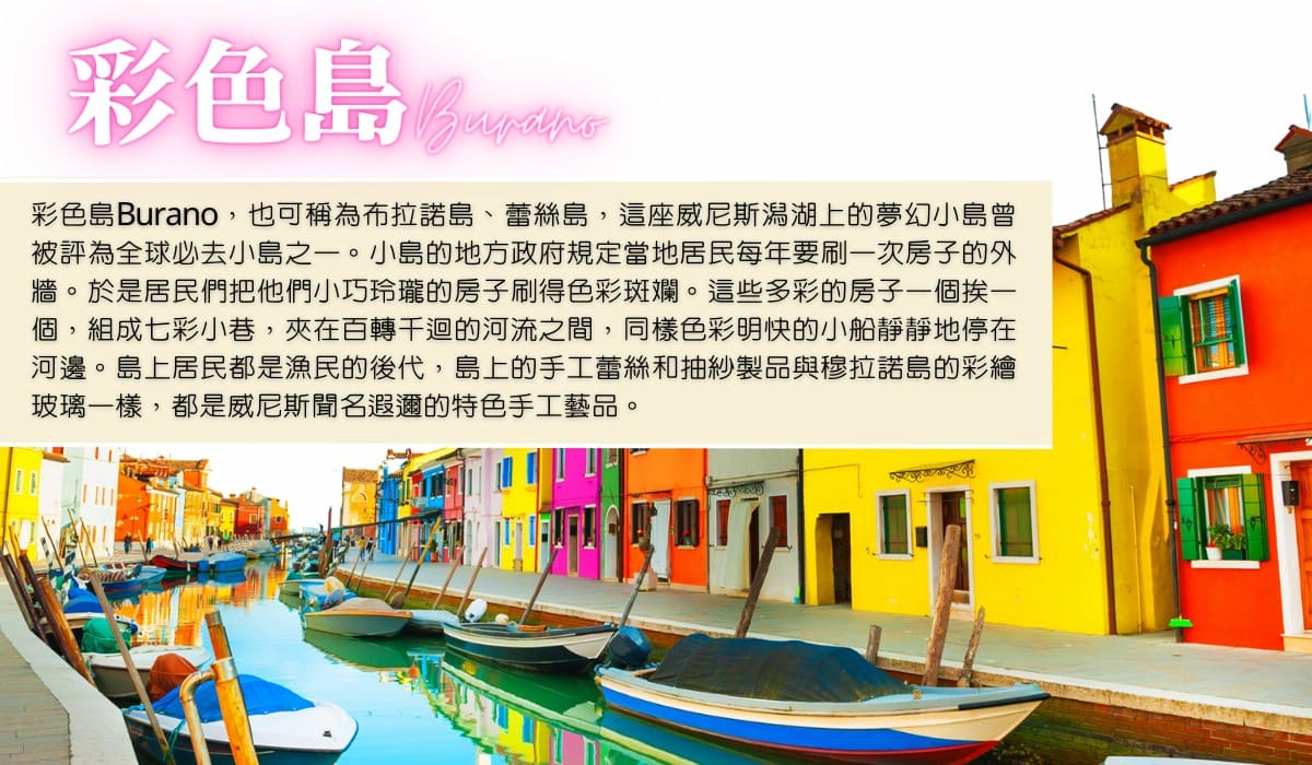 第10相送~ 威尼斯被稱為水上之都,是世界聞名的浪漫城市,特別安排彩色島及貢多拉遊船、遊覽著數不清的蜿蜒水道。